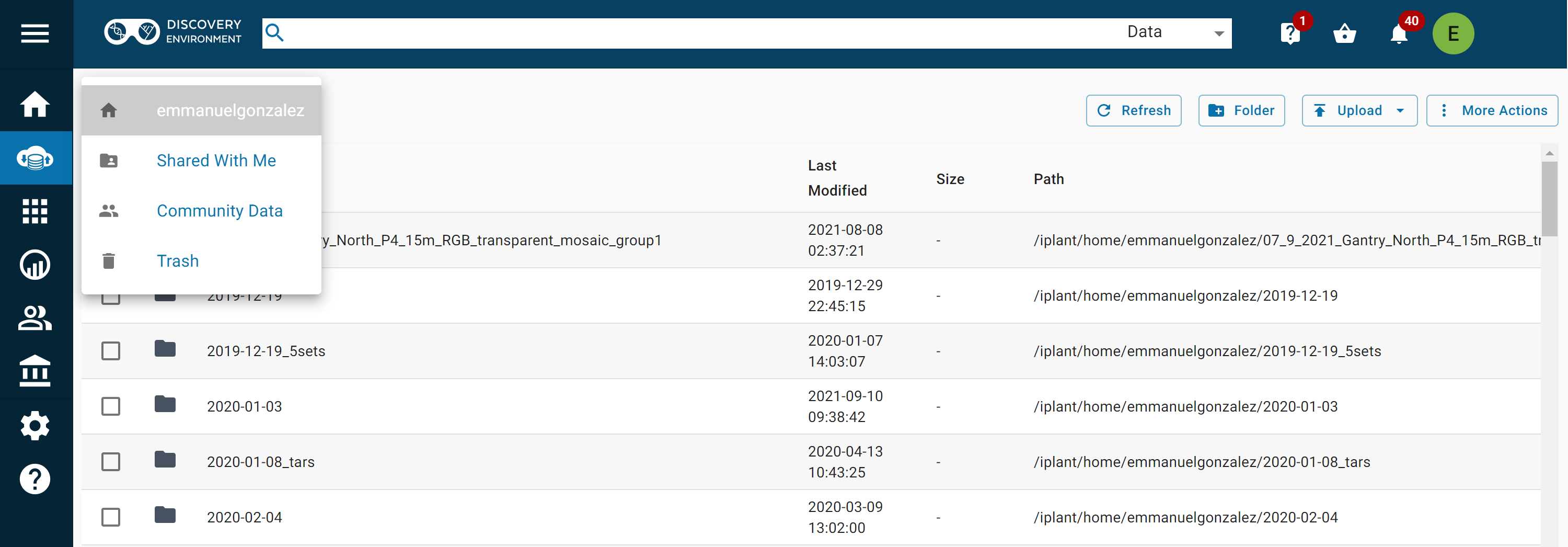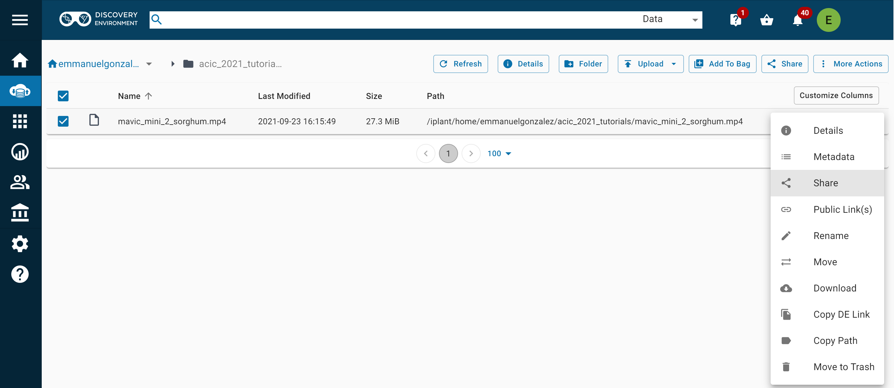 iput -N 0 -PVT mavic_mini_2_sorghum.mp4Go to the CyVerse Data Store and navigate to your home directory.
